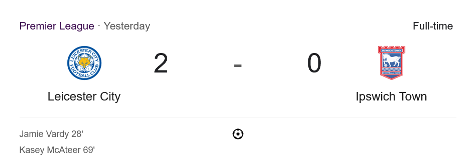 ครึ่งหลังเลสเตอร์ไม่ผ่อนเกม ยังคงเปิดเกมรุกและหาจังหวะสวนกลับ ขณะที่อิปสวิชแม้จะครองบอลได้บ้างแต่ยังไม่มีจังหวะจบแบบได้ลุ้น จนกระทั่งนาทีที่ 69 เจ้าบ้านมาบวกเพิ่มอีกลูกจาก เคซีย์ แมคอาทีร์ ที่ตัดบอลกลางสนามแล้วลากลุยเดี่ยวเข้าไปซัดเสียบเสาแบบสุดสวยเป็น 2-0 ปิดกล่องแบบเด็ดขาด