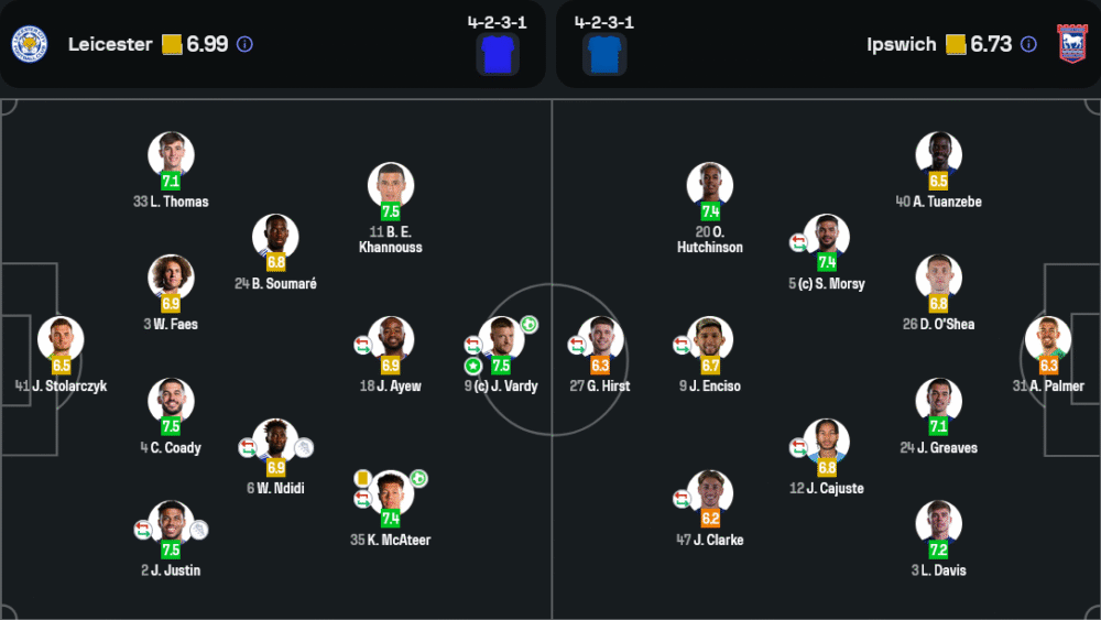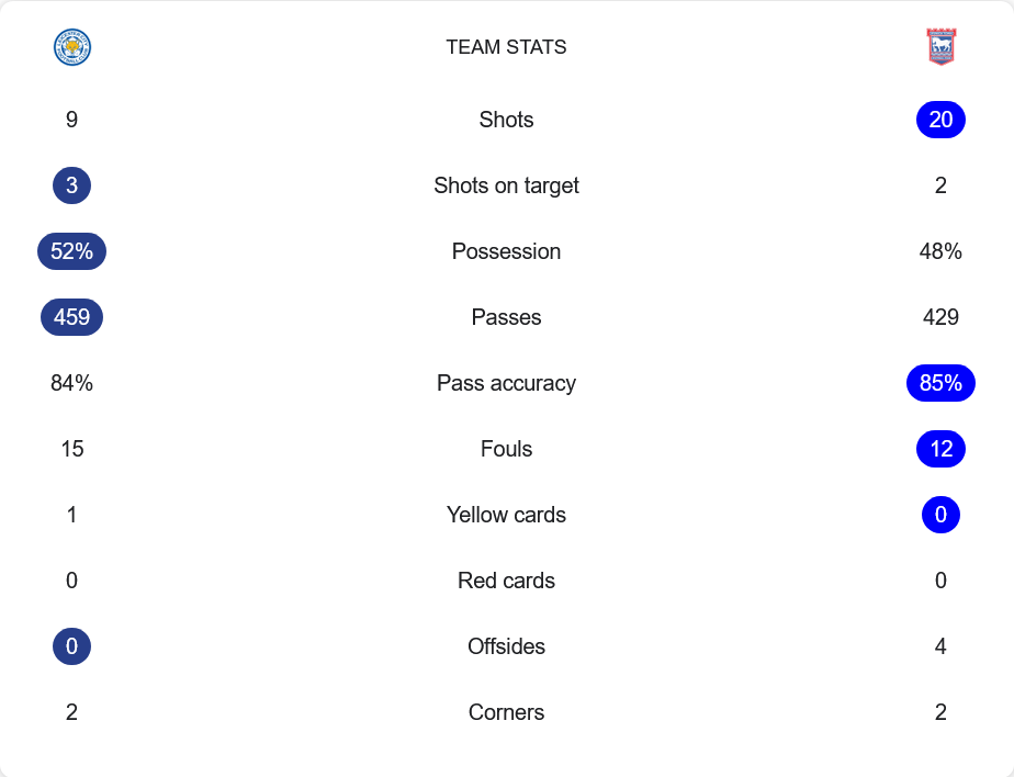 ทั้งสองทีมใช้ระบบ 4-2-3-1 เหมือนกัน แต่การจัดวางจังหวะเกมต่างกันอย่างชัดเจน เลสเตอร์เน้นความสมดุลทั้งรุกและรับ โดยใช้ เอ็นดิดี้ และ ซูมาเร่ คุมจังหวะกลางสนาม พร้อมให้วาร์ดี้จบสกอร์จากลูกทะลุช่อง ส่วนอิปสวิชแม้จะมีการครองบอลเกือบสูสี แต่จังหวะเข้าทำขาดความเฉียบ และแนวรับมักเปิดพื้นที่ให้เจาะง่ายในช่วงเวลาสำคัญ