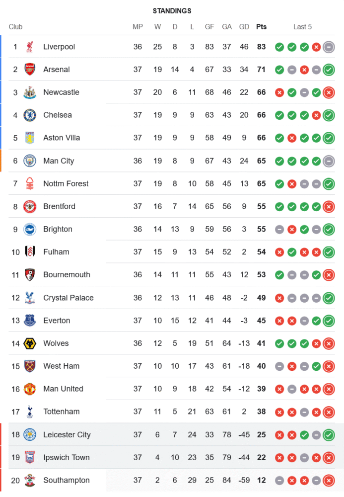 นัดสุดท้ายของฤดูกาลใน ตารางบอล พรีเมียร์ลีก 2025 จะลงเตะพร้อมกันในวันที่ 25 พฤษภาคม เวลา 22:00 น. อิปสวิช ทาวน์ จะเปิดบ้านเจอกับ เวสต์แฮม ยูไนเต็ด ขณะที่ เลสเตอร์ ซิตี้ ต้องบุกไปเยือน บอร์นมัธ ซึ่งทั้งสองเกมนี้จะเป็นด่านตัดสินชะตาว่าทีมไหนจะรอด ทีมไหนจะตกไปสู่แชมเปียนชิพ