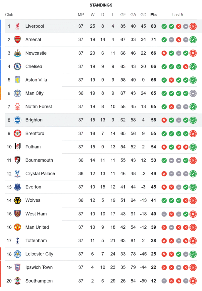 สำหรับเกมนัดสุดท้ายของฤดูกาลใน ตารางบอล พรีเมียร์ลีก ลิเวอร์พูลจะเปิดบ้านชนกับ คริสตัล พาเลซ วันที่ 25 พฤษภาคม 2568 เวลา 22:00 น. ขณะที่ไบรท์ตันจะบุกไปเยือน ท็อตแน่ม ฮ็อตสเปอร์ ในวันเดียวกัน ซึ่งทั้งสองทีมต่างหวังปิดฤดูกาลด้วยชัยชนะเพื่ออันดับที่ดีที่สุดในตาราง