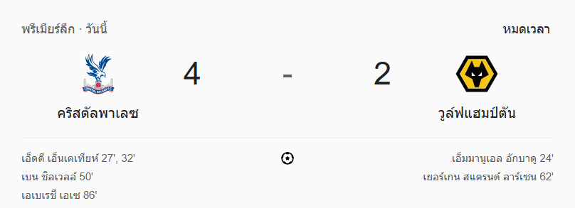 เสียงนกหวีดหมดเวลา ผลบอลสด คู่นี้คือ คริสตัล พาเลซ 4-2 วูล์ฟแฮมป์ตัน แม้ทีมเยือนจะออกนำก่อน แต่เจ้าถิ่นกลับมาได้อย่างยอดเยี่ยม โดยเฉพาะฟอร์มของ เอ็นเคเทียห์ กับ เอเซ ที่ทำเกมรุกได้ดุดันจนเกมนี้กลายเป็นแมตช์คุณภาพแห่งสัปดาห์