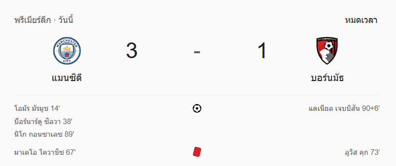 - นาทีที่ 97: จบเกม แมนเชสเตอร์ ซิตี้ เปิดบ้านชนะ บอร์นมัธ 3-1