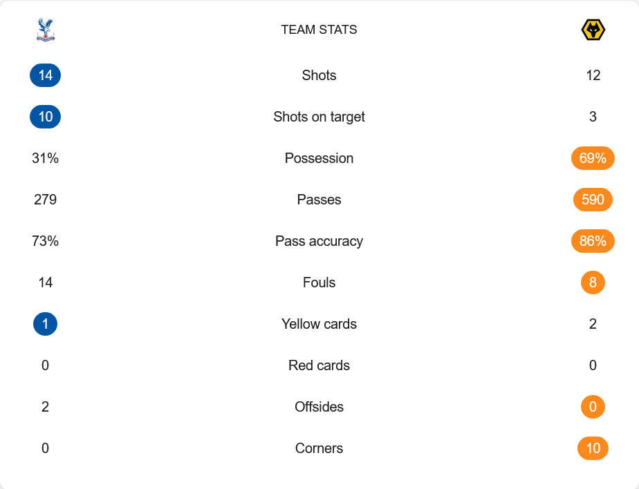 แม้วูล์ฟส์จะครองเกมเหนือกว่าชัดเจนทั้งเปอร์เซ็นต์การครองบอล (69%) และจำนวนการจ่ายบอลที่มากถึง 590 ครั้ง (ความแม่นยำ 86%) เทียบกับพาเลซที่จ่ายบอลเพียง 279 ครั้ง ความแม่น 73% แต่ทีมเจ้าบ้านกลับทำได้ดีกว่าในพื้นที่สุดท้าย โดยยิงรวม 14 ครั้ง เข้ากรอบถึง 10 หน ขณะที่วูล์ฟส์ยิงเพียง 12 ครั้ง และตรงกรอบแค่ 3 ครั้ง อีกหนึ่งความน่าสนใจคือพาเลซได้ 0 ลูกเตะมุม แต่กลับยิงได้ 4 ประตูจากโอเพ่นเพลย์ ขณะที่วูล์ฟส์ได้ถึง 10 มุม แต่ไร้ประโยชน์ในจังหวะเข้าทำ