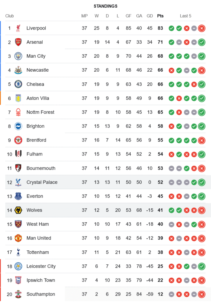 หลังจบเกมนี้ คริสตัล พาเลซ เก็บเพิ่มเป็น 52 คะแนนจาก 37 นัด ขยับขึ้นมารั้งอันดับ 12 อย่างมั่นคงและหมดห่วงเรื่องตกชั้นแน่นอน ขณะที่วูล์ฟแฮมป์ตัน แม้จะมีช่วงฟอร์มร้อนแรงช่วงกลางเดือนมีนาคมถึงเมษายน แต่การพ่ายสามนัดติดส่งท้ายซีซันทำให้พวกเขารั้งที่ 14 มี 41 คะแนน และต้องลุ้นรักษาสถิติเกมสุดท้ายไม่ให้หล่นอันดับอีก