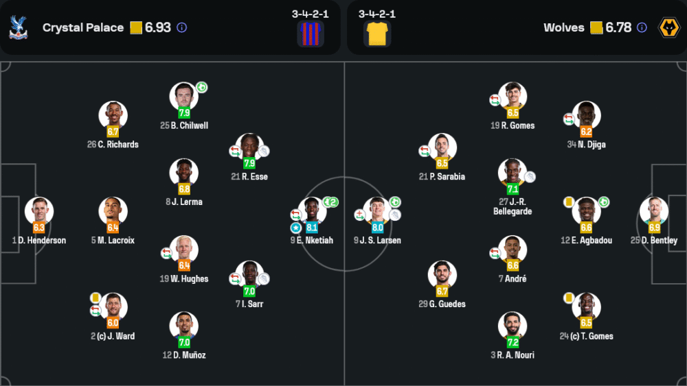 เอ็ดดี้ เอ็นเคเทียห์ หัวหอกเบอร์ 9 ของพาเลซ คว้ารางวัล Player of the Match ด้วยคะแนนสูงสุด 8.1 จากผลงานยิง 2 ประตูสุดเฉียบขาดในครึ่งแรก เปลี่ยนโมเมนตัมเกมให้พาเลซกลับมาได้อย่างสมบูรณ์ นอกจากความคมแล้ว เขายังมีบทบาทในการพาบอลเข้าเขตอันตรายและดึงแนวรับวูล์ฟส์ให้หลุดตำแหน่งอยู่ตลอด