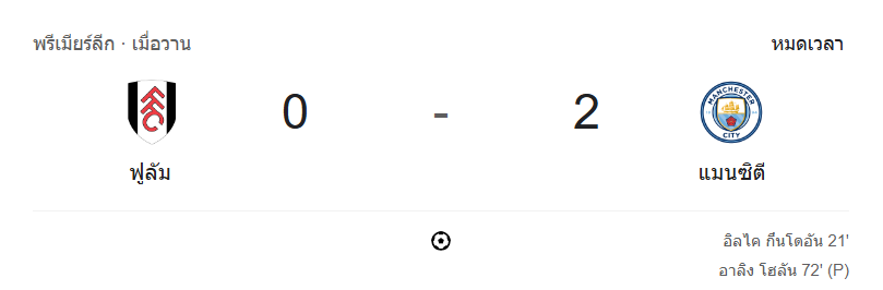 บ้านกีฬา สรุปศึกนี้ว่า “เรือใบสีฟ้า” แมนเชสเตอร์ ซิตี้ โชว์ฟอร์มเหนือชั้น บุกเก็บสามแต้มสำคัญในนัดปิดฤดูกาล ด้วยประตูสุดสวยของกุนโดกัน และจุดโทษของฮาแลนด์ ส่งผลให้ซิตี้จบอันดับ 3 ของตาราง พร้อมคว้าตั๋ว ยูฟ่า แชมเปียนส์ลีก ฤดูกาลหน้าได้สำเร็จ ขณะที่ฟูแล่มแม้จะสู้เต็มที่ แต่ไม่สามารถต้านทานความแข็งแกร่งของซิตี้ได้