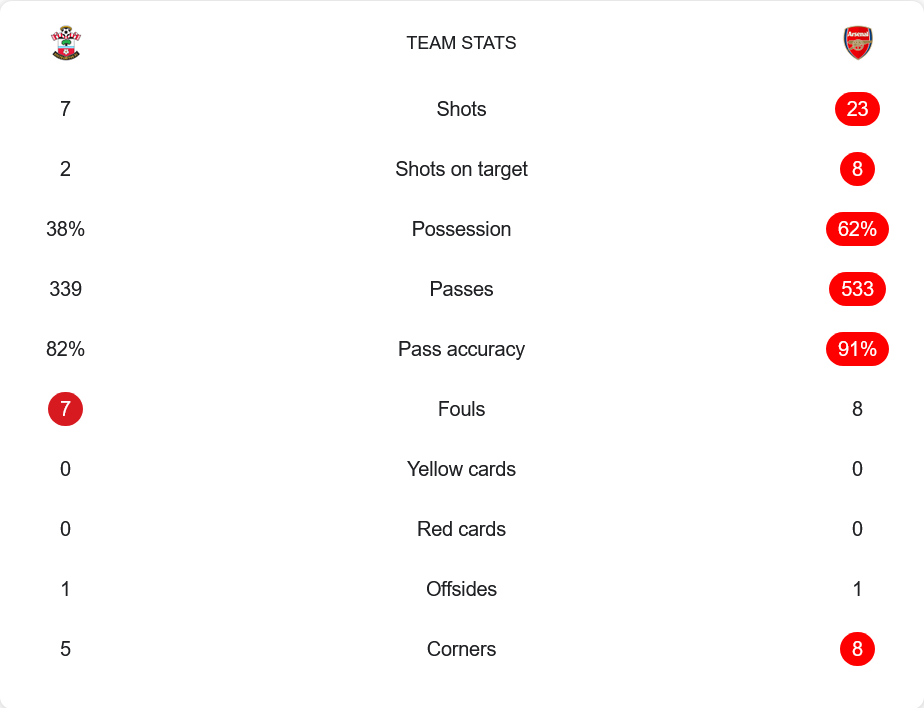 แม้เซาแธมป์ตันจะเปิดบ้านสู้เต็มที่ แต่ภาพรวมเป็นอาร์เซนอลที่เหนือกว่าทุกมิติ โดยพวกเขาครองบอลถึง 62% เทียบกับ 38% ของเจ้าบ้าน ยิงรวมทั้งสิ้น 23 ครั้ง เข้ากรอบ 8 ครั้ง ขณะที่เจ้าบ้านยิงเพียง 7 ครั้ง เข้ากรอบ 2 ครั้ง อาร์เซนอลจ่ายบอล 533 ครั้งด้วยความแม่นยำ 91% ส่วนเซาแธมป์ตันจ่าย 339 ครั้ง ความแม่นยำ 82% ทั้งสองทีมไม่มีใบเหลืองหรือใบแดงในเกมนี้ และเตะมุมฝั่งปืนใหญ่ได้มากถึง 8 ครั้งเทียบกับเซาแธมป์ตันเพียง 5