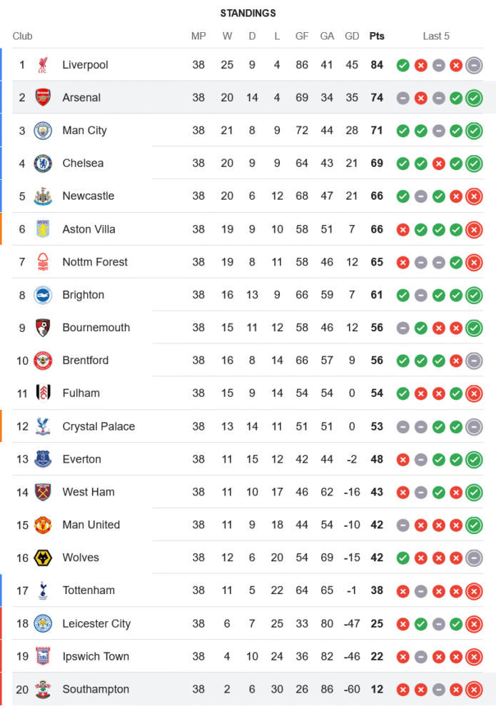 ชัยชนะนัดนี้ทำให้ อาร์เซนอล จบฤดูกาลด้วยอันดับ 2 บนตารางพรีเมียร์ลีก 2025 มี 74 แต้ม จาก 38 นัด เป็นรองแค่ลิเวอร์พูลที่คว้าแชมป์ด้วย 84 แต้ม โดยอาร์เซนอลเบียดแมนฯ ซิตี้ (71 แต้ม) และเชลซี (69 แต้ม) ไปแบบไม่ต้องลุ้นจนนัดสุดท้าย ด้านเซาแธมป์ตัน จบฤดูกาลด้วยการเป็นบ๊วย มีเพียง 12 คะแนน ตกชั้นอย่างเป็นทางการ