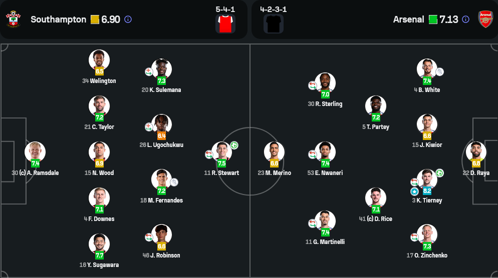 ตัวสำรองที่ลงสนาม: บูกาโย่ ซาก้า, เลอันโดร ทรอสซาร์, มาร์ติน โอเดการ์ด, ไค ฮาแวร์ตซ์, ไมลส์ ลูอิส-สเคลลี