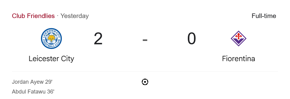 แม้จะเป็นเกมกระชับมิตรแต่ชัยชนะนัดนี้ช่วยเพิ่มความมั่นใจให้กับ เลสเตอร์ ซิตี้ อย่างชัดเจน เพราะนับเป็นนัดที่ 4 จาก 5 เกมหลังสุดที่พวกเขาเก็บชัยได้ก่อนเปิดซีซั่น ขณะที่ ฟิออเรนติน่า หยุดสถิติชนะรวดไว้ที่ 2 นัด และต้องเร่งแก้จุดอ่อนก่อนเจอน็อตติ้งแฮม ฟอเรสต์ และ แมนเชสเตอร์ ยูไนเต็ด ในโปรแกรมที่กำลังจะมาถึง