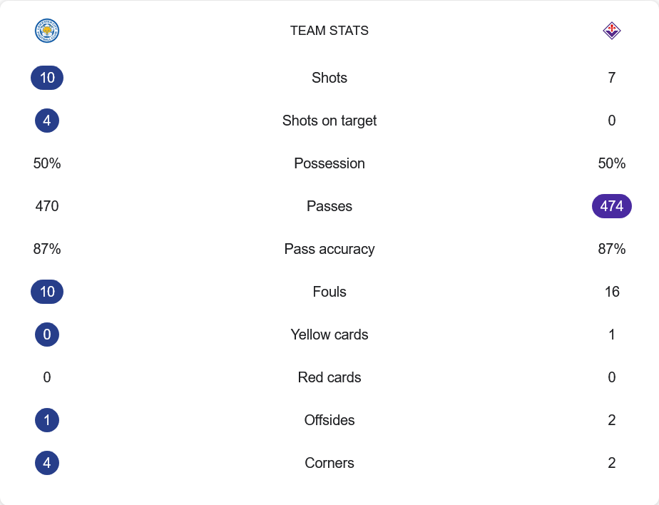เกมนี้เป็นอีกหนึ่งแมตช์ที่ตัวเลขครองบอลบอกไม่ได้ทั้งหมด เพราะแม้เลสเตอร์และฟิออเรนติน่าจะครองบอลพอๆ กันที่ 50% แต่ต่างกันที่การสร้างสรรค์เกมรุก จิ้งจอกยิงได้ 10 ครั้ง เข้ากรอบ 4 ครั้ง และได้มา 2 ประตู ส่วนฟิออเรนติน่าแม้จะยิง 7 ครั้งแต่ไม่ตรงกรอบแม้แต่ครั้งเดียว การผ่านบอลของทั้งคู่ใกล้เคียงกัน (เลสเตอร์ 470 ครั้ง, ฟิออเรนติน่า 474 ครั้ง) และมีความแม่นยำ 87% เท่ากัน ฟิออเรนติน่าฟาวล์มากถึง 16 ครั้ง เทียบกับ 10 ครั้งของเลสเตอร์ และยังโดนใบเหลืองไปอีก 1 ใบ