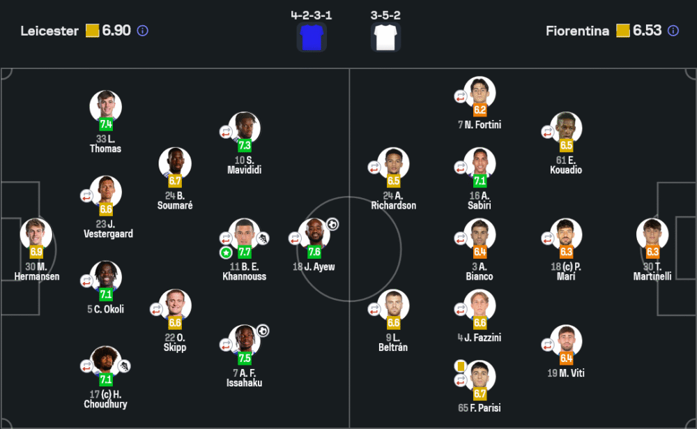 ครึ่งแรก เลสเตอร์เปิดเกมรุกกดดันตั้งแต่ต้น และมาได้ประตูขึ้นนำในนาทีที่ 29 เมื่อ บิลาล เอล คานนุส จ่ายบอลทะลุแนวรับให้ จอร์แดน อายิว ซัดเต็มข้อเสียบเสาเข้าไปอย่างเฉียบขาด จากนั้นเพียง 7 นาทีให้หลัง นาทีที่ 36 ฮัมซ่า เชาดูรี่ เติมเกมจากด้านขวาก่อนจ่ายตัดหลังให้ ฟาตาวู อิสซาฮาคู บรรจงยิงเข้าไปไม่พลาด กลายเป็น 2-0 อย่างรวดเร็ว เกมรับของเลสเตอร์แน่นหนา ตัดเกมสวนกลับของฟิออเรนติน่าได้อยู่หมัด ก่อนจบครึ่งแรกแบบไร้ปัญหา