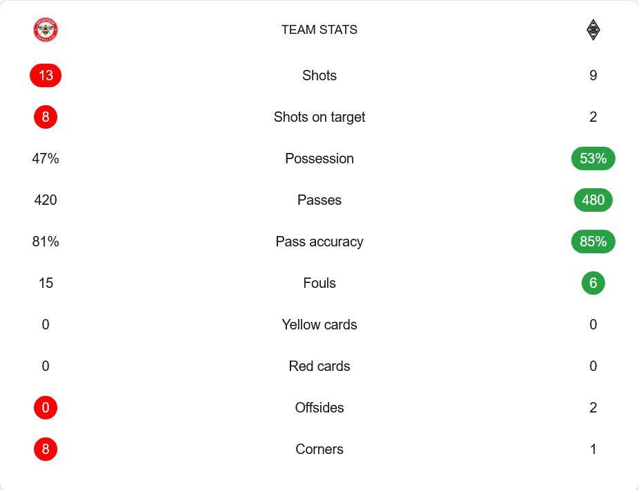 เกมนี้เบรนท์ฟอร์ดมีโอกาสยิงมากกว่า 13 ต่อ 9 เข้ากรอบถึง 8 ต่อ 2 แต่ครองบอลน้อยกว่าที่ 47% ต่อ 53% จ่ายบอลสำเร็จ 81% จาก 420 ครั้ง ขณะที่กลัดบัคจ่ายแม่นกว่าเล็กน้อย 85% จาก 480 ครั้ง ฟาวล์เจ้าถิ่นมากถึง 15 ครั้ง ส่วนทีมเยือนเพียง 6 ครั้ง เตะมุมเบรนท์ฟอร์ดได้ 8 ครั้ง กลัดบัคได้เพียง 1 ครั้ง
