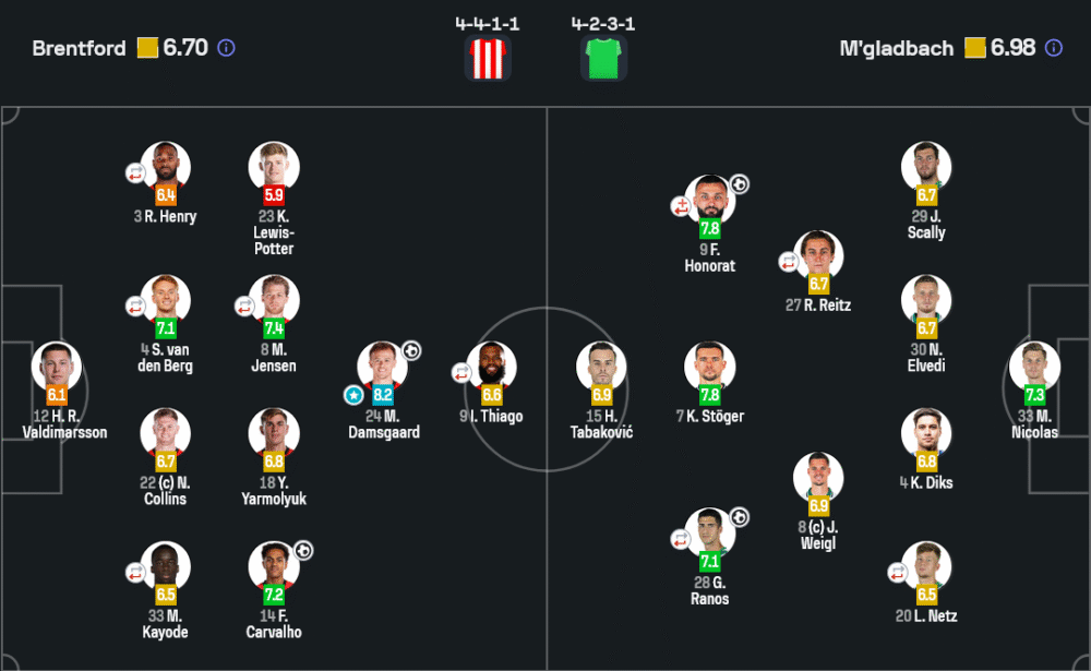 มิคเกล ดัมส์การ์ด ปีกเดนมาร์กของเบรนท์ฟอร์ดคือจุดแตกต่างในเกมนี้ ด้วยคะแนนสูงสุด 8.2 เขามีส่วนสร้างโอกาสหลายครั้งและยิงประตูสำคัญให้ทีมขึ้นนำ การเลี้ยงกินตัวและการเคลื่อนที่หาช่องทำให้แนวรับกลัดบัคปั่นป่วนตลอดเกม