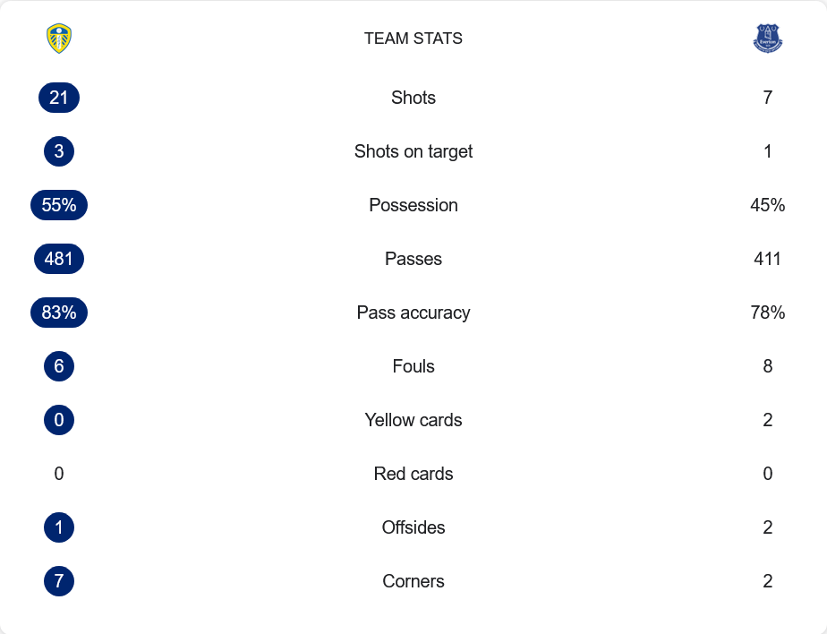 รูปเกมสะท้อนชัดจากตัวเลข: ลีดส์ยิงทั้งหมด 21 ครั้ง เข้ากรอบ 3 ครั้ง ครองบอล 55% จ่ายบอล 481 ครั้ง ความแม่นยำ 83% ขณะที่เอฟเวอร์ตันมีโอกาส 7 ครั้ง เข้ากรอบ 1 ครั้ง ครองบอล 45% จ่าย 411 ครั้ง แม่นยำ 78% เกมดุเดือดพอประมาณ ฟาวล์ 6 ต่อ 8 ใบเหลืองฝั่งเยือน 2 ต่อ 0 ออฟไซด์ 1 ต่อ 2 และเตะมุม ลีดส์เหนือกว่าชัดเจน 7 ต่อ 2 ตัวเลขทั้งหมดบอกว่าเจ้าบ้านคุมโทนและกดดันได้ต่อเนื่องจนปลายเกม