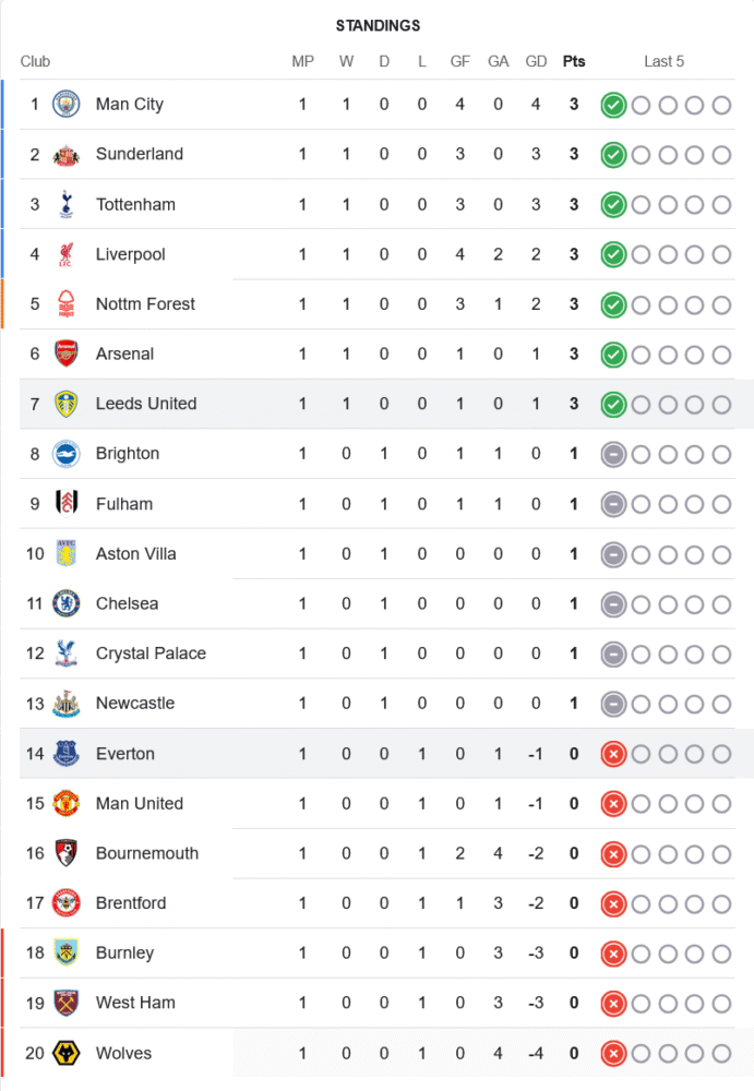 สามแต้มแรกทำให้ลีดส์ทะยานขึ้นอันดับ 7 มี 3 คะแนน ประตูได้เสีย +1 ในขณะที่เอฟเวอร์ตันอยู่อันดับ 14 ยังไม่มีแต้มและประตูได้เสีย -1 แม้จะเป็นแค่นัดเปิดฤดูกาล แต่โมเมนตัมเริ่มเทไปทางยูงทอง ส่วนทอฟฟี่ต้องเร่งจูนเกมรุกก่อนโปรแกรมถัดไปจะหนักขึ้น