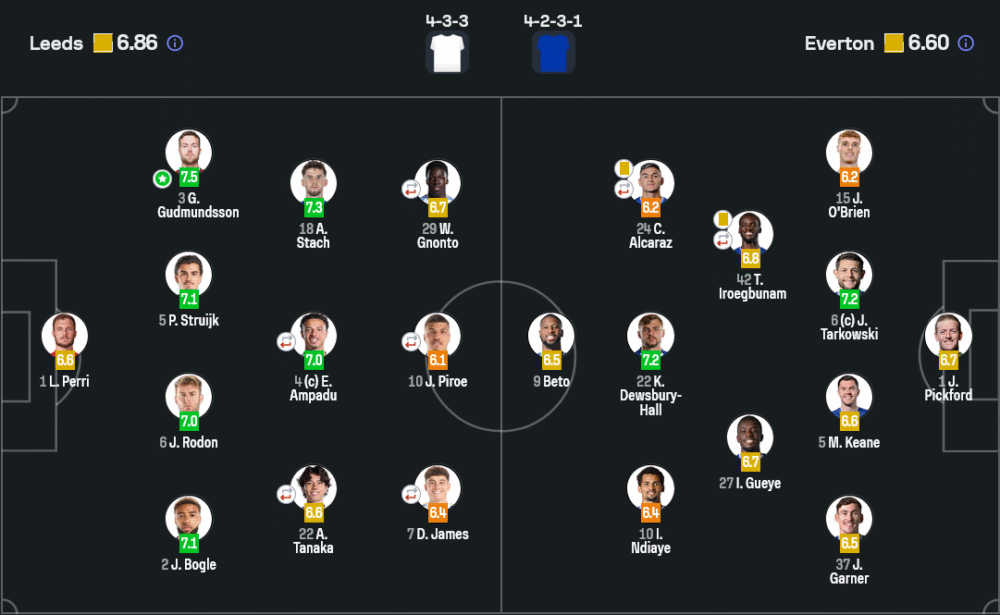 กาบรีเอล กุดมุนด์สสัน (ลีดส์) เรตติ้ง 7.5 โดดเด่นทั้งเกมรุกและรับ เติมกดดันฝั่งซ้ายตลอด 90 นาที เก็บงานเกมรับแน่น ช่วยเซ็ตอัพหลายจังหวะสำคัญ สมศักดิ์ศรีแข้งยอดเยี่ยมประจำแมตช์