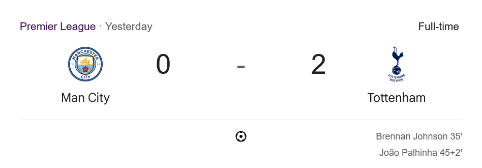 เกมเปิดแลกตั้งแต่ต้น ซิตี้ครองบอลเหนือกว่าอย่างเห็นได้ชัด แต่โดนดักสวนกลับ นาที 35 เป็นจังหวะคมของสเปอร์ส ริชาร์ลิซอนพักบอลเข้ากรอบ ก่อนส่งต่อให้ เบรนแนน จอห์นสัน ซัดเสียบตาข่ายนำ 1-0 นาที 45+2 ความผิดพลาดจากแนวรับเจ้าถิ่นเปิดทางให้ เจา ปาลินญ่า กองกลางตัวรับสอดขึ้นมายิงเพิ่มเป็น 2-0 สร้างความเงียบงันทั้งสนาม เรือใบเจอเกมเพรสหนักและไม่สามารถหาช่องเข้าทำแบบถนัด