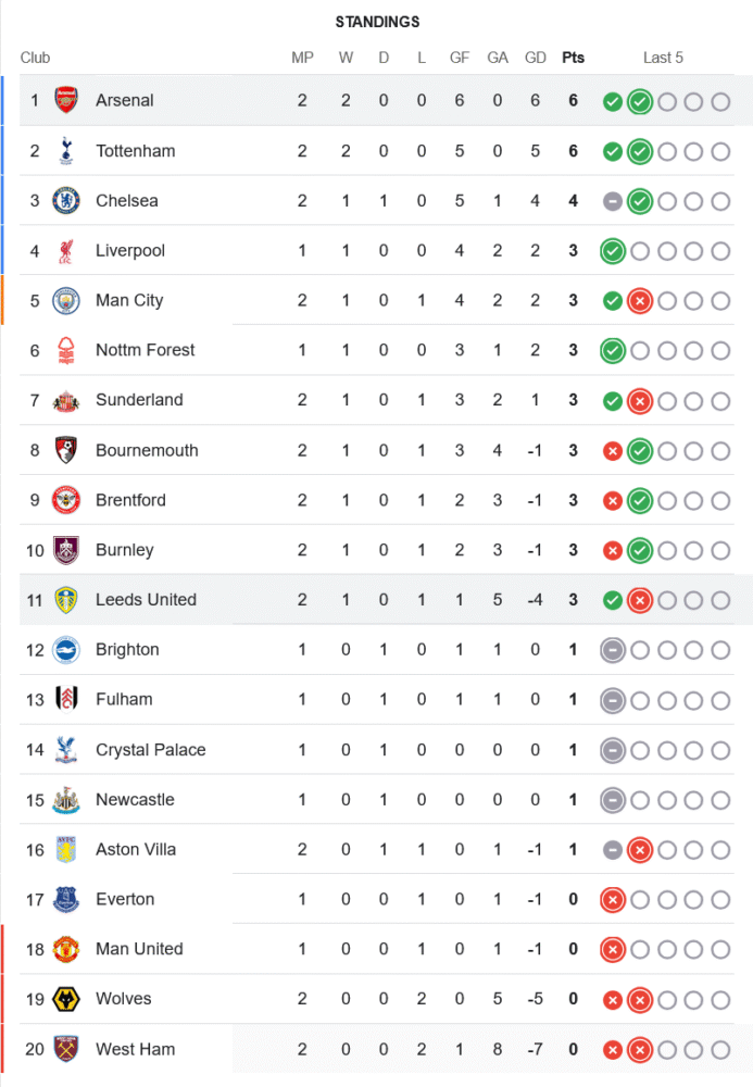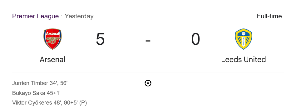 ชัยชนะถล่มทลายนี้ส่งให้อาร์เซนอลเก็บ 6 แต้มเต็มจาก 2 นัด รั้งจ่าฝูงพรีเมียร์ลีกด้วยผลต่างประตูได้เสีย +6 ขณะที่ลีดส์หล่นไปอยู่กลางตารางอันดับ 11 มีเพียง 3 คะแนนจากการชนะนัดแรกกับเอฟเวอร์ตัน