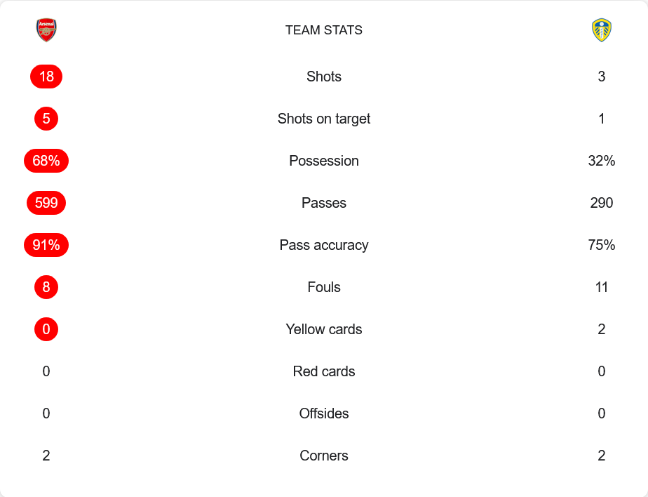 เกมนี้อาร์เซนอลครองบอลมากถึง 68% จ่ายบอลเกือบ 600 ครั้งด้วยความแม่นยำสูงถึง 91% สร้างโอกาสยิง 18 ครั้ง เข้ากรอบ 5 และเปลี่ยนเป็น 5 ประตูเต็ม ๆ ในขณะที่ลีดส์มีโอกาสเพียง 3 ครั้ง เข้ากรอบแค่ 1 หน ความแตกต่างของคุณภาพทีมชัดเจน ฟาวล์รวม 19 ครั้ง มีใบเหลืองเกิดขึ้น 2 ใบจากฝั่งทีมเยือน