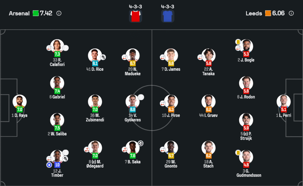 วิเคราะห์บอล เกมนี้ชัดเจนว่า อาร์เซนอลใช้แผน 4-3-3 ได้อย่างลงตัว การเชื่อมเกมจากแดนกลางไรซ์และโอเดการ์ดพาทีมครองบอลสูงถึง 68% การเล่นริมเส้นของซาก้าและมาดูเอเก้เปิดพื้นที่ให้กยอเคเรสหาพื้นที่เข้าทำได้ง่าย ขณะที่เกมรับมั่นใจเมื่อมีทิมเบอร์และซาลิบาคุมหลังบ้าน ตรงกันข้าม ลีดส์แม้ตั้งระบบ 4-3-3 เช่นกัน แต่การประสานงานขาดความแน่นอน ครองบอลได้เพียง 32% และไม่มีจังหวะจบสกอร์ที่สร้างอันตรายจริงจัง