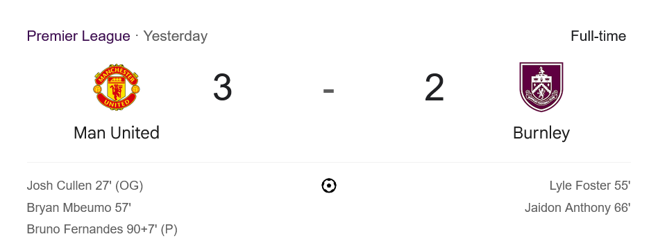 เบิร์นลี่ย์ไม่ยอมง่ายๆ นาที 55 ไล่ตีเสมอ 1-1 จาก ไคล์ ฟอสเตอร์ ที่หลุดเข้าไปยิงผ่านบาเยินดีร์ แต่เพียง 2 นาทีถัดมา (น.57) บรูย็อง เอ็มเบวโม่ ยิงให้แมนยูขึ้นนำอีกครั้งเป็น 2-1 เกมยังแลกกันมันส์ นาที 66 จาดอน แอนโธนี่ สบโอกาสยิงตีเสมอให้เบิร์นลี่ย์ 2-2 ความกดดันกลับมาสู่เจ้าบ้านอีกครั้ง จนช่วงทดเจ็บนาที 90+7 บรูโน่ แฟร์นันเดส ซัดจุดโทษปิดกล่องให้แมนยูเฉือนชนะ 3-2 แบบสุดระทึก
