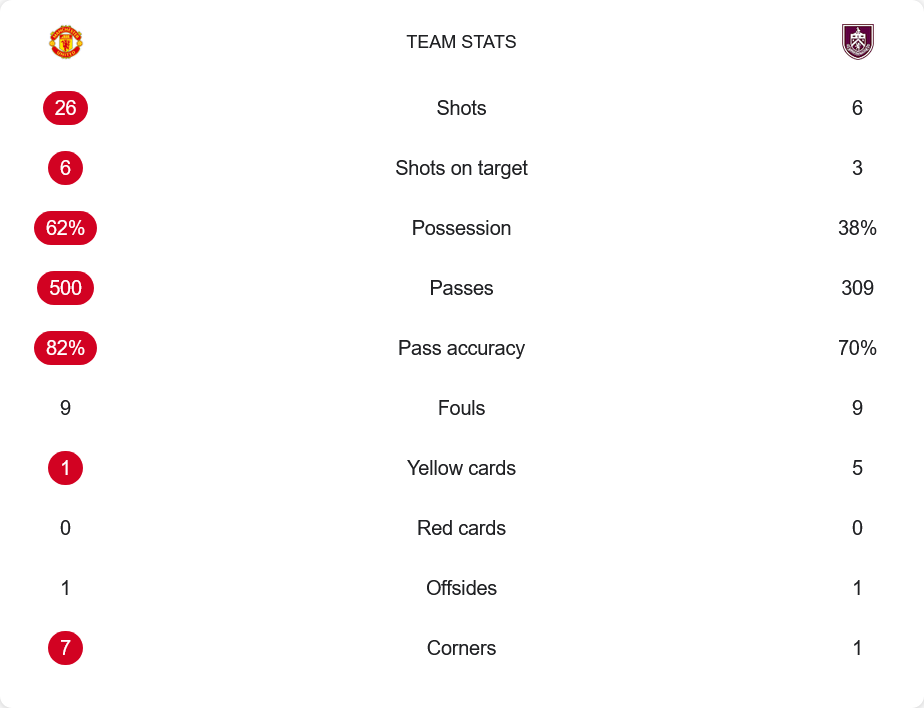 แมนยูครองบอล 62% จ่ายบอล 500 ครั้ง ความแม่นยำ 82% ยิงทั้งหมด 26 ครั้ง เข้ากรอบ 6 ได้ลูกเตะมุม 7 ฟาวล์ 9 ใบเหลือง 1 ส่วนเบิร์นลี่ย์ครองบอล 38% จ่ายบอล 309 ครั้ง แม่นยำ 70% ยิง 6 เข้ากรอบ 3 ได้เตะมุม 1 ฟาวล์ 9 ใบเหลืองมากถึง 5 แสดงถึงเกมรับที่ใช้การตัดฟาวล์หยุดเกมบ่อยครั้ง