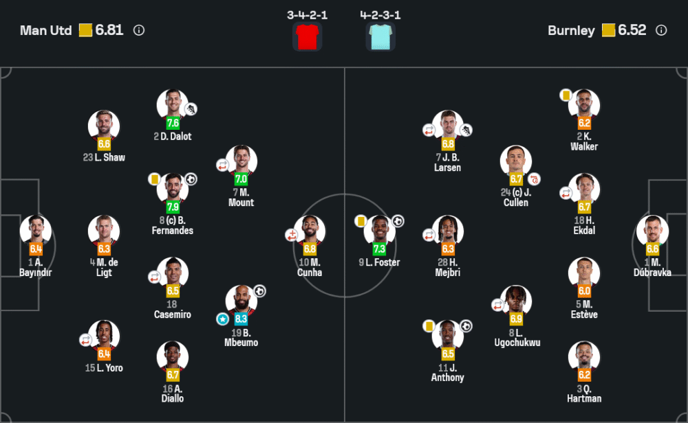 แมนยูภายใต้ระบบ 3-4-2-1 เน้นการครองบอล (62%) ใช้ บรูโน่ และเมาท์เป็นตัวเชื่อมแดนกลาง ส่วนเอ็มเบวโม่สร้างความปั่นป่วนให้เกมรับเบิร์นลี่ย์ได้ตลอดทั้งเกม การรับยังคงมีรอยรั่วเมื่อเจอบอลโต้กลับเร็วของทีมเยือน แต่เกมรุกหลากหลายและมีแรงกดดันต่อเนื่องช่วยให้คว้าสามแต้มได้ ขณะที่เบิร์นลี่ย์เล่นแผน 4-2-3-1 เน้นเกมสวนกลับ ใช้ฟอสเตอร์เป็นหอกเป้า เกมรับแม้จะมีระเบียบแต่ยังพลาดง่ายเมื่อโดนบุกหนัก การวิเคราะห์ชี้ว่าแมนยูเหนือกว่าชัดเจนในแดนกลางและความเด็ดขาดช่วงท้ายเกม
