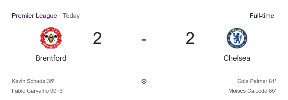 กลับมาครึ่งหลัง เชลซีปรับเกมบุกเร็ว และได้ผลในนาที 61 เมื่อ โคล พาล์มเมอร์ ตัวสำรองที่เพิ่งลงสนามมากดประตูตีเสมอ 1-1 จากนั้นนาที 85 มอยเซส ไกเซโด้ ซัดบอลเสียบเสาให้เชลซีแซงนำ 2-1 เกมเหมือนจะจบลงด้วยชัยชนะของทีมเยือน แต่แล้วช่วงทดเจ็บนาที 90+3 ฟาบิโอ คาร์วัลโญ่ ตัวสำรองของเบรนท์ฟอร์ดก็ซัดดับฝันสิงห์บลูส์ ตีเสมอ 2-2 ส่งแฟนเจ้าถิ่นระเบิดเฮลั่น