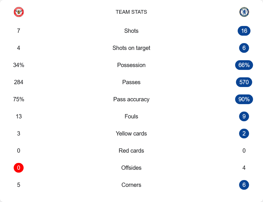 เกมนี้เชลซีครองบอลมากถึง 66% ผ่านบอล 570 ครั้ง ความแม่นยำสูงถึง 90% แต่กลับได้ผลลัพธ์เพียงแต้มเดียว ยิงทั้งหมด 16 ครั้ง เข้ากรอบ 6 ครั้ง ส่วนเบรนท์ฟอร์ดแม้ครองบอลแค่ 34% ยิงเพียง 7 ครั้ง แต่เข้ากรอบถึง 4 ครั้ง และทำได้ 2 ประตู แสดงให้เห็นถึงความคมและการใช้โอกาสอย่างมีประสิทธิภาพ ฟาวล์รวมกันกว่า 22 ครั้ง ทำให้เกมนี้เต็มไปด้วยการปะทะและดราม่าในทุกจังหวะ