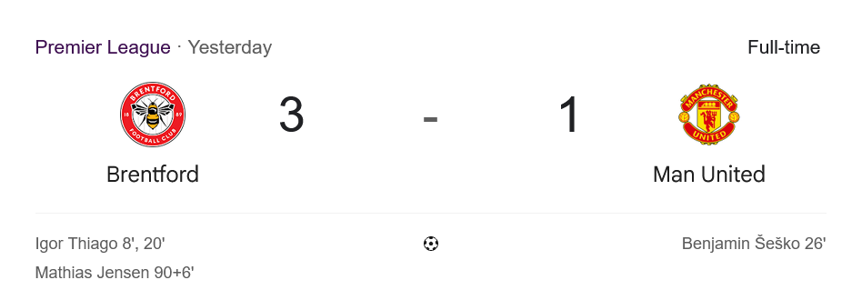 จาก : ผลบอลสด พรีเมียร์ลีก ระหว่าง เบรนท์ฟอร์ด 3-1 แมนเชสเตอร์ ยูไนเต็ด วันนี้ 27/9/68 – บ้านกีฬา