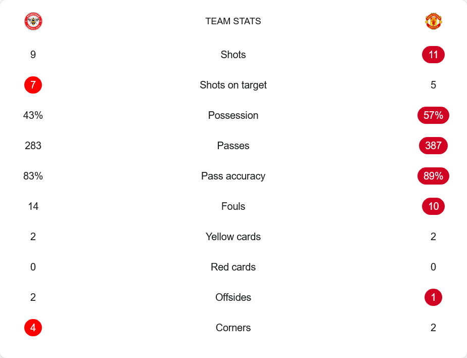 รูปเกมสะท้อนชัด ยูไนเต็ดครองบอลมากกว่า 57% ต่อ 43% จ่ายบอลรวม 387 ต่อ 283 ความแม่นยำ 89% เหนือกว่า 83% แต่ความอันตรายเป็นของเบรนท์ฟอร์ดที่ยิงเข้ากรอบ 7 ครั้งจากโอกาสทั้งหมด 9 ครั้ง ขณะที่ผีแดงได้เข้ากรอบ 5 จาก 11 ครั้ง ลูกตั้งเตะเจ้าบ้านทำได้ดีกว่าด้วยเตะมุม 4 ต่อ 2 เกมหนักพอๆ กัน ใบเหลืองฝั่งละ 2 ทว่าฟาวล์เบรนท์ฟอร์ด 14 ครั้งมากกว่า 10 ของยูไนเต็ด—แลกกับการหยุดเกมรุกทีมเยือนได้ผล