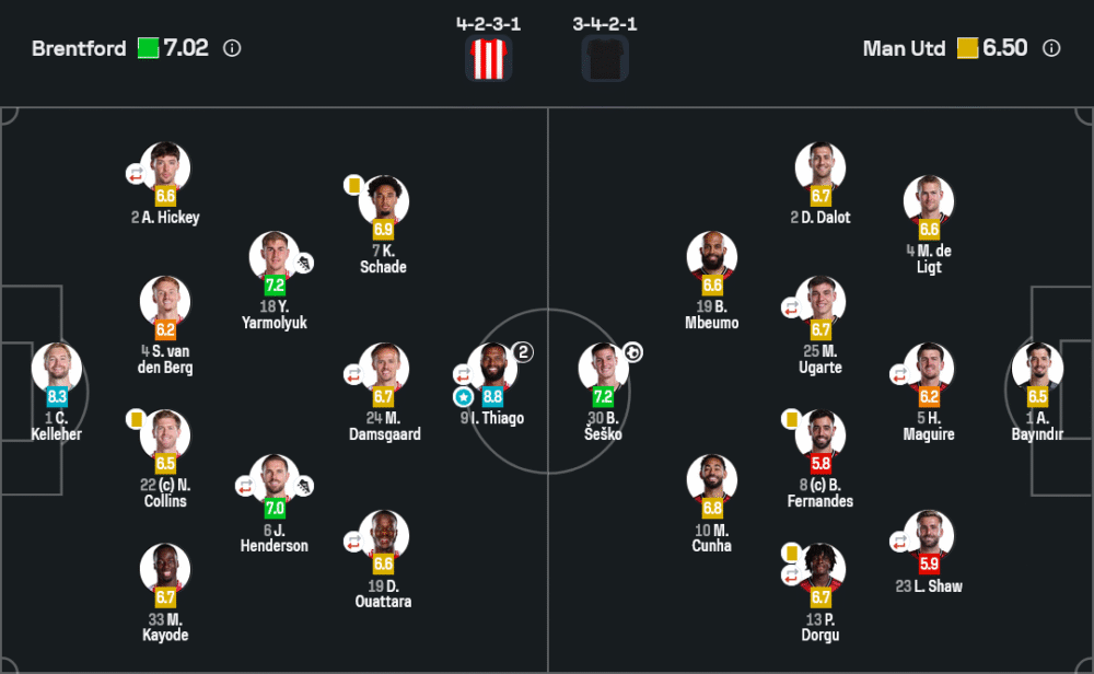 ครึ่งหลังยูไนเต็ดพยายามเร่งสปีดเกม เปลี่ยน ค็อบบี้ เมนู และ เลนี โยโร ลงมาช่วยยืนคุมจังหวะในนาที 66 ก่อนจะมาถึงจุดเปลี่ยน นาที 76 บรูโน่ได้สังหารจุดโทษแต่เคลเลเฮอร์พุ่งปัดมหัศจรรย์ รักษาสกอร์นำไว้ได้ ท้ายเกมโอกาสทีมเยือนแผ่วลง เบรนท์ฟอร์ดเสริมสดด้วย เคน ลูวิส-พ็อตเตอร์, ริโก้ เฮนรี่, ออนเยก้า และยานเนลท์ ก่อนจะปิดไฟนาที 90+6 เมื่อมิคอลา ยาร์โมลยุค ฉีกขึ้นขวาเปิดให้ มาธิอัส เยนเซ่น โฉบยิง 3-1 จบเกมสามแต้มล้ำค่าของเจ้าบ้าน