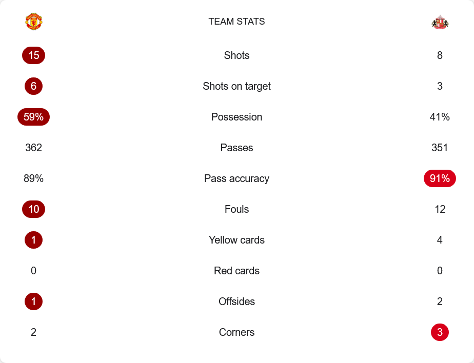 แม้ ซันเดอร์แลนด์ จะครองบอลเพียง 41% แต่มีความแม่นยำในการจ่ายสูงถึง 91% อย่างไรก็ตาม แมนฯ ยูไนเต็ด มีโอกาสยิงมากถึง 15 ครั้ง เข้ากรอบ 6 ครั้ง เทียบกับ 8 ครั้งของทีมเยือน เกมนี้เจ้าบ้านฟาวล์น้อยกว่า (10 ต่อ 12) และเสียใบเหลืองแค่ 1 ใบ ขณะที่ทีมเยือนโดน 4 ใบ สะท้อนให้เห็นว่าแมนยูเล่นอย่างมีระเบียบ และคุมเกมได้อยู่หมัด