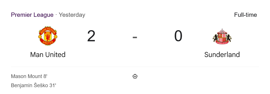 การแข่งขันเมื่อคืนที่ผ่านมาในศึก พรีเมียร์ลีก อังกฤษ ที่สนามโอลด์ แทรฟฟอร์ด จบลงด้วยชัยชนะของ แมนเชสเตอร์ ยูไนเต็ด ที่เปิดบ้านเอาชนะ ซันเดอร์แลนด์ 2-0 โดยได้สองประตูจาก เมสัน เมาท์ นาทีที่ 8 และ เบนจามิน เซสโก้ นาทีที่ 31 เก็บสามแต้มสำคัญ พร้อมอัปเดต ผลบอลสด ล่าสุด ขยับแต้มขึ้นไปรั้งอันดับ 9 ของตาราง