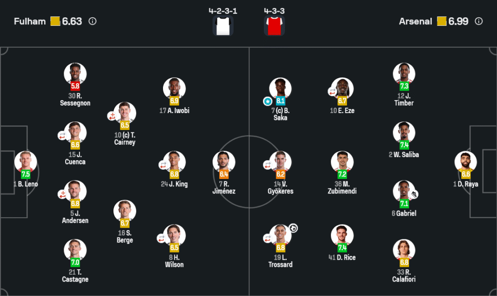 บูกาโย ซาก้า ปีกความเร็วสูงของอาร์เซนอลได้รับเลือกเป็น “ผู้เล่นยอดเยี่ยมประจำเกม” ด้วยคะแนน 8.1 เขาเป็นจุดเปลี่ยนสำคัญของแนวรุกทีมเยือน สร้างโอกาสอย่างต่อเนื่อง ป่วนแนวรับของฟูแล่มจนเสียสมดุล และเปิดพื้นที่ให้เพื่อนเล่นง่ายขึ้น แม้จะไม่มีชื่อบนสกอร์บอร์ด แต่ซาก้าโดดเด่นตลอด 90 นาที