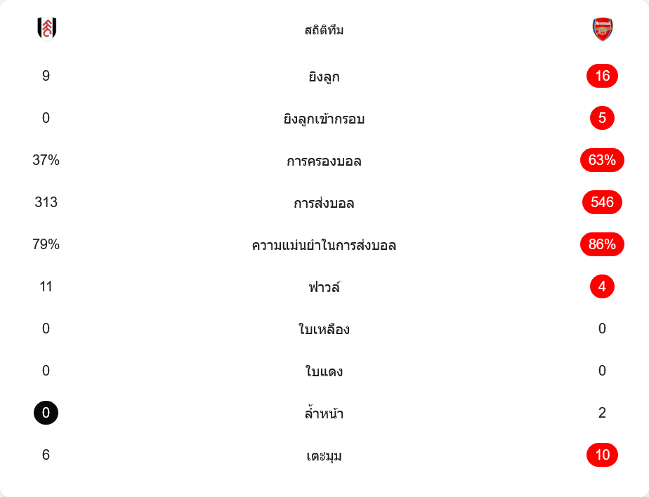 เกมนี้ อาร์เซนอลโชว์ความเหนือชั้นด้วยการครองบอลมากถึง 63% และมีโอกาสยิงถึง 16 ครั้ง เข้ากรอบ 5 ครั้ง ส่วนฟูแล่มได้ยิงเพียง 9 ครั้ง และไม่มีลูกเข้ากรอบเลย การผ่านบอลของปืนใหญ่สูงถึง 546 ครั้ง ด้วยความแม่นยำ 86% ขณะที่เจ้าบ้านผ่านบอล 313 ครั้ง ความแม่นยำ 79% ฟูแล่มฟาวล์ถึง 11 ครั้ง ส่วนอาร์เซนอลทำฟาวล์เพียง 4 ครั้ง เตะมุม 10 ต่อ 6 สะท้อนภาพการบุกที่ไหลลื่นและดุดันของทีมเยือน