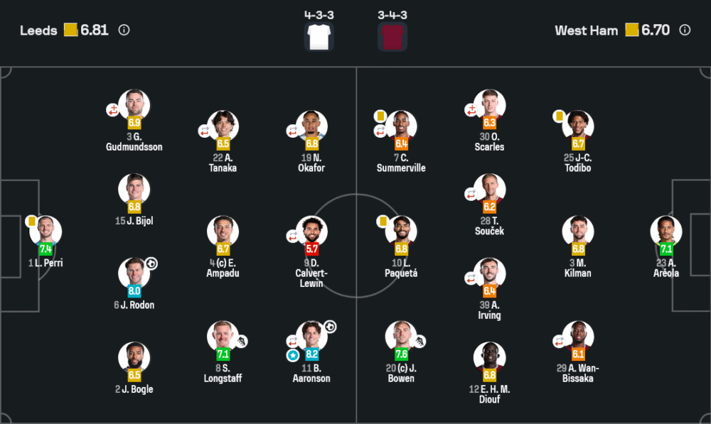 เบรนเดน อารอนสัน (ลีดส์ ยูไนเต็ด) เรตติ้ง 8.2 ปั่นป่วนแนวรับเวสต์แฮมตั้งแต่นาทีแรก สอดหาพื้นที่เก่ง กดประตูปลดล็อก พร้อมสร้างโอกาสเพื่อนร่วมทีมตลอด 60-70 นาทีแรก เป็นจุดเริ่มต้นเกมรุกแทบทุกคลื่นบุกของเจ้าบ้าน