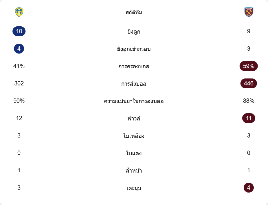 เวสต์แฮมครองบอลมากกว่า 59% ต่อ 41% และจ่ายบอล 446 ต่อ 302 ครั้ง แต่ความคมเป็นของลีดส์ที่ยิงเข้ากรอบ 4 จาก 10 ครั้ง เทียบกับทีมเยือน 3 จาก 9 ครั้ง เกมหนักหน่วงพอกัน ฟาวล์ 12 ต่อ 11 ใบเหลืองเท่ากันฝั่งละ 3 ลูกเตะมุมเวสต์แฮมมากกว่า 4 ต่อ 3 ขณะที่ความแม่นยำในการส่งบอลใกล้เคียง 90% vs 88% สะท้อนรูปเกมที่ขุนค้อนคุมบอล ทว่าเจ้าถิ่นคมกว่าในจังหวะชี้เป็นชี้ตาย