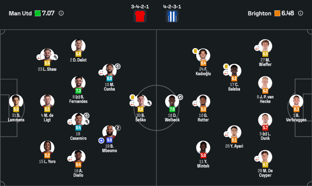 ตัวสำรอง: Heaven (6.9), Dorgu (6.1), Mainoo (6.2), Ugarte (6.8), Zirkzee (6.5)