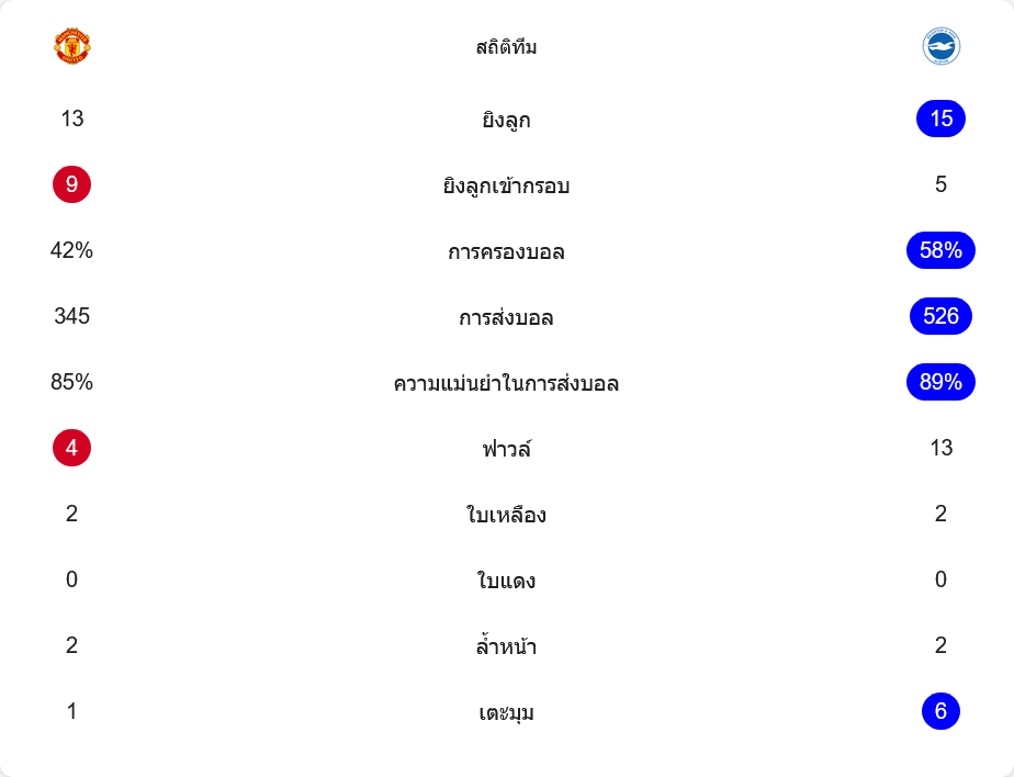 แม้ไบรท์ตันจะครองบอลมากถึง 58% เหนือกว่าแมนยูที่มีเพียง 42% แต่จังหวะจบสกอร์ของเจ้าถิ่นกลับเฉียบคมกว่า ชนะในจำนวนการยิงเข้ากรอบถึง 9 ครั้งจากทั้งหมด 13 ครั้ง ขณะที่ทีมเยือนมีโอกาสยิงมากถึง 15 ครั้งแต่จบเพียง 5 ครั้งเท่านั้น ความแม่นยำของไบรท์ตันในการส่งบอลสูงถึง 89% แต่ไม่สามารถแปรเปลี่ยนเป็นสกอร์ได้เพราะการรับของเจ้าบ้านแข็งแกร่ง ขณะที่แมนยูฟาวล์เพียง 4 ครั้ง ตัดเกมได้เนียน ขณะที่ไบรท์ตันฟาวล์ไปถึง 13 ครั้ง