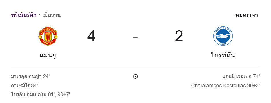 ท้ายเกมนาที 90+2 ไบรท์ตันตีตื้นมา 3-2 จาก Charalampos Kostoulas สร้างความลุ้นระทึกให้แฟนบอลทีมเยือน แต่ช่วงทดเวลานาที 90+6 เอ็มเบวโม่ คนเดิมก็มาซัดปิดกล่องให้แมนยูคว้าชัย 4-2 อย่างสุดมันส์ เกมนี้เป็นอีกหนึ่งแมตช์ที่ตอบโจทย์สายลุ้น ผลบอลสด แบบสุดระทึกตั้งแต่นาทีแรกถึงวินาทีสุดท้าย