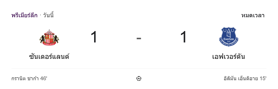 ศึก พรีเมียร์ลีก คู่นี้เปิดมาโคตรเดือด ซันเดอร์แลนด์ในบ้านเจอกับเอฟเวอร์ตัน เกมนี้แฟนๆจับตาดู ผลบอลสด กันทั้งประเทศ เพราะเจ้าถิ่นมีลุ้นเกาะกลุ่มบนหัวตาราง ส่วนทอฟฟี่ต้องการแต้มหนีโซนล่าง สุดท้ายจบด้วยสกอร์ 1-1 แบ่งกันไปทีมละแต้ม แต่เรื่องราวในสนามมันส์กว่านั้นเยอะ