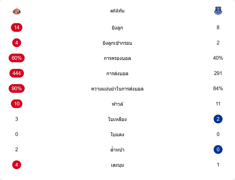 ตัวเลขหลังเกมยืนยันทุกอย่าง ซันเดอร์แลนด์ยิงรวม 14 ครั้ง เข้ากรอบ 4 ครั้ง ขณะที่เอฟเวอร์ตันมีเพียง 8 กับ 2 ครั้งเท่านั้น เจ้าถิ่นครองบอลถึง 60% ต่อบอลกันลื่นไหลรวม 444 ครั้ง ความแม่นยำสูงถึง 90% แสดงให้เห็นว่าคอนโทรลเกมได้อยู่มือเกือบตลอด ขณะที่ทอฟฟี่ครองบอลแค่ 40% จ่ายไป 291 ครั้ง ความแม่นยำก็ถือว่าใช้ได้ 84% แต่ส่วนใหญ่เป็นการรับแล้วเคลียร์ออก ไม่ใช่การต่อเกมบุกจริงจัง