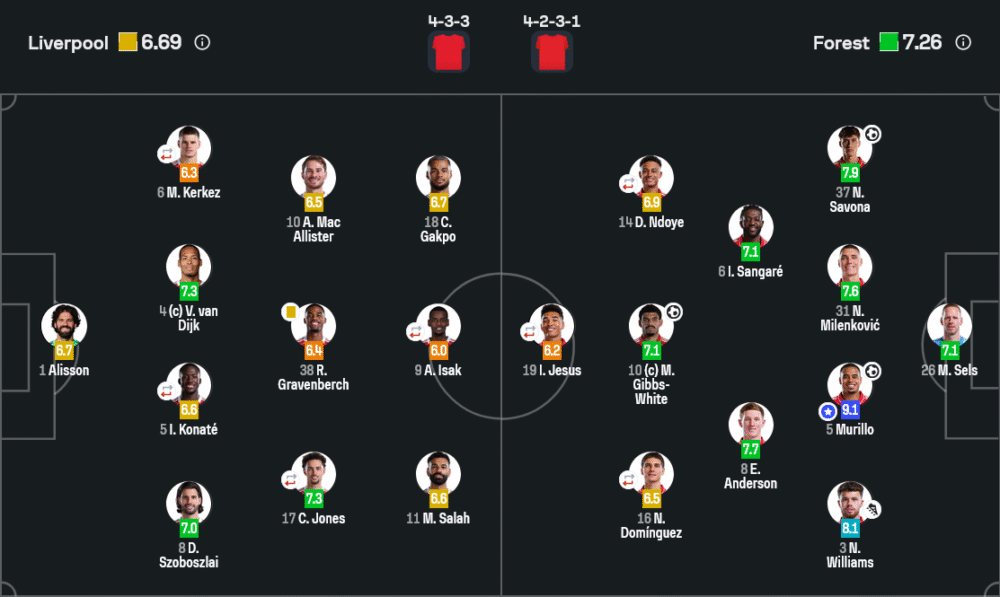 รางวัลยอดเยี่ยมประจำเกมต้องยกให้ เฟลิเป้ มูริโญ่ เซนเตอร์ฮาล์ฟของฟอเรสต์ ที่ได้เรตติ้งสูงถึง 9.1 ไม่ใช่แค่ยิงประตูแรกที่เปลี่ยนหน้าเกมให้ทีมเยือนขึ้นนำ แต่ยังคุมแนวรับได้อย่างยอดเยี่ยม อ่านจังหวะบอลยาวของลิเวอร์พูลได้หมด สกัดลูกกลางอากาศและลูกครอสจากริมเส้นแทบทุกครั้ง ทำให้แนวรุกเจ้าบ้านเล่นยากตลอด 90 นาที