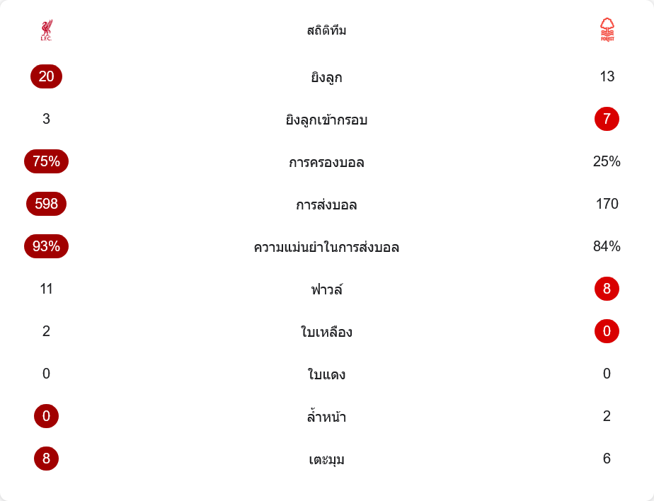 แม้ตัวเลขจะชี้ว่า ลิเวอร์พูลเหนือกว่าแทบทุกด้าน ยิงรวม 20 ครั้ง ครองบอลถึง 75% ส่งบอลมากถึง 598 ครั้ง และมีความแม่นยำในการจ่ายถึง 93% ขณะที่ฟอเรสต์ยิงเพียง 13 ครั้ง ครองบอล 25% ส่งบอลแค่ 170 ครั้ง แต่มีโอกาสยิงเข้ากรอบถึง 7 ครั้ง มากกว่าเจ้าบ้านเกือบสามเท่า นั่นสะท้อนว่าทีมเยือนใช้โอกาสอย่างมีคุณภาพกว่า