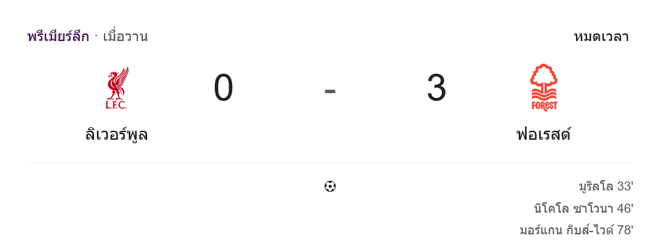 จาก : ผลบอลสด พรีเมียร์ลีก ระหว่าง ลิเวอร์พูล 0-3 น็อตติ้งแฮม ฟอเรสต์ วันนี้ 22/11/68 – บ้านกีฬา