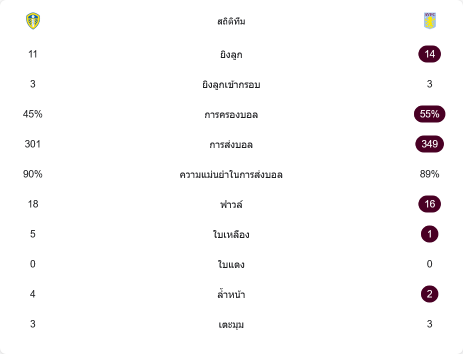 เมื่อมองตัวเลขหลังเกมจะเห็นว่าภาพรวมค่อนข้างสูสี ลีดส์ยิงทั้งหมด 11 ครั้ง เข้ากรอบ 3 ครั้ง ส่วนวิลล่ายิง 14 ครั้ง เข้ากรอบ 3 ครั้งเท่ากัน แปลว่าทีมเยือนจบสกอร์คมกว่าเพราะเปลี่ยนโอกาสสำคัญเป็นประตูได้ทั้งสองลูก การครองบอลวิลล่าเหนือกว่าที่ 55% ต่อ 45% ของลีดส์ สะท้อนชัดว่าหลังพักครึ่งทีมของเอเมรีคุมจังหวะเกมไว้ในมือ