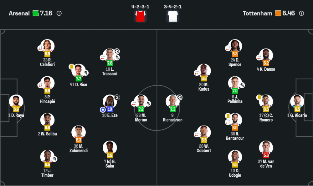 ฝั่งสเปอร์ส แผน 3-4-2-1 ตั้งใจใช้คูดุสกับโดแบร์ตเป็นตัวรับบอลระหว่างไลน์ แต่เมื่อวิงแบ็กลงมาช่วยเกมรับลึกเกินไป ช่องระหว่างกลางและริมเส้นจึงกว้าง ทำให้โดนทรอสซาร์ดกับซากาโจมตีซ้ำ ๆ และเมื่อต้องไล่ตามสกอร์ โธมัส แฟรงก์เลือกส่งแนวรุกเพิ่ม แต่กลับยิ่งเปิดพื้นที่ให้เอเซมีช่องเล่นสวนกลับจนแฮตทริกสำเร็จ