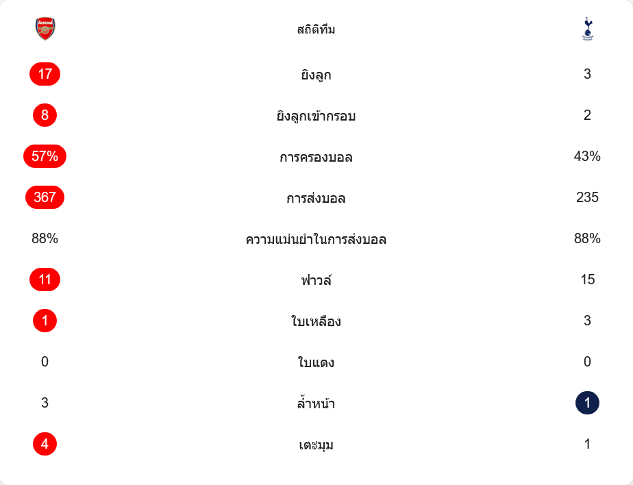 ตัวเลขหลังเกมยืนยันภาพในสนามชัดเจน อาร์เซนอลครองบอล 57% ต่อ 43% ของสเปอร์ส พร้อมโหมบุกใส่ทั้งเกมด้วยโอกาสยิง 17 ครั้ง เข้ากรอบถึง 8 ขณะที่ทีมเยือนยิงได้เพียง 3 ครั้ง เข้ากรอบ 2 ครั้งเท่านั้น การต่อบอลของเจ้าบ้านก็เหนือกว่าอย่างชัดเจน ส่งบอลสำเร็จ 367 ครั้ง เทียบกับ 235 ครั้งของสเปอร์ส แต่ที่น่าสนใจคือเปอร์เซ็นต์ความแม่นยำทั้งคู่เท่ากันที่ 88% แสดงให้เห็นว่าพื้นที่ที่สเปอร์สได้บอลมักจะอยู่ในโซนที่อาร์เซนอลยอมให้เล่น